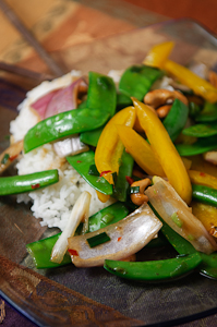 This recipe was published in the June 2011 launch of the 28-day challenge. It caught my eye because the protein is coming from cashews – yummy! This made plenty of stir-fry; I served rice with Adrien’s portion — but ate mine au naturel.
