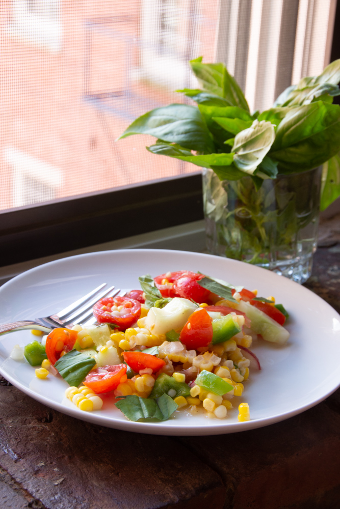 With a lot of corn in our recent CSA box – and a ton of tomatoes and cukes – Adrien found this salad from Holly Nilsson on the Spend with Pennies website. It is a welcome summer dish and very adaptable to whatever is growing that suits your fancy.