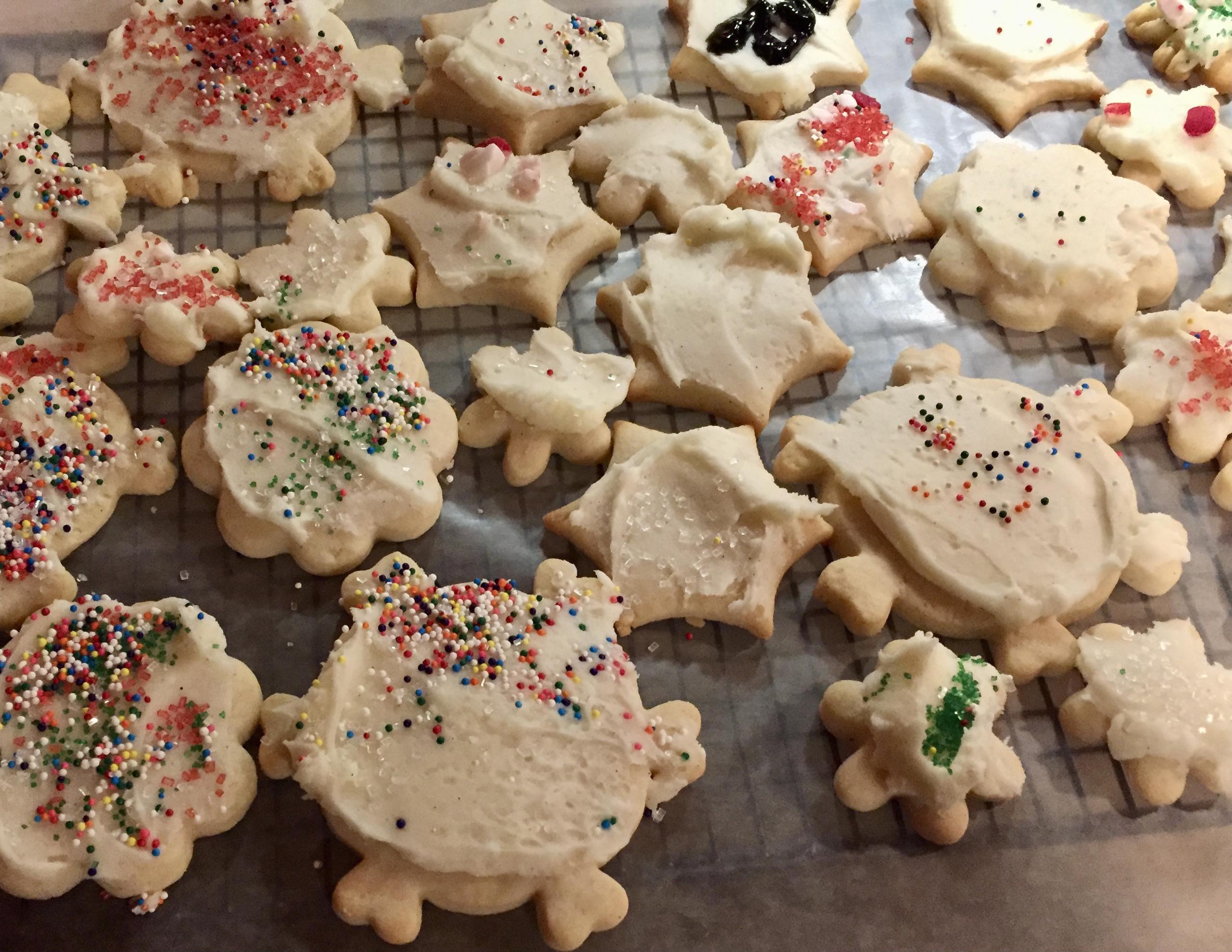 One of my fondest childhood food memories is of the big rectangular tin of cutout cookies my Aunt Eleanor used to make for the four of us each Christmas and Easter. She had collected an impressive array of cutout shapes which, when I had to downsize, went to another family member. I love her recipe – which includes a box of lemon or orange gelatin as one of the cups of sugar.