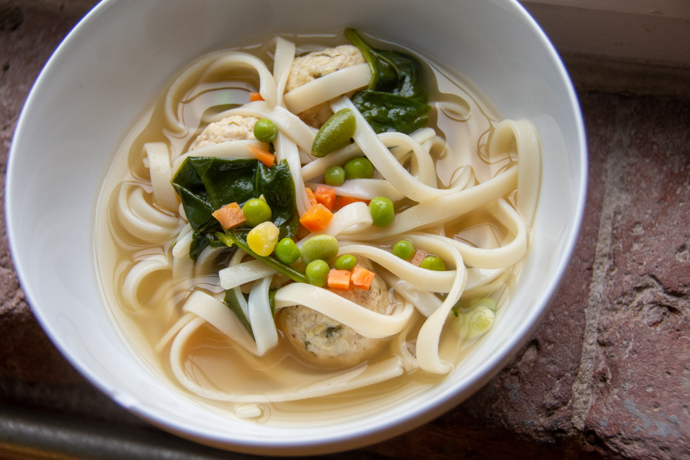 Bring the broth to a boil in the pot, then lower the heat so that it simmers. If your meatballs have been frozen, drop them into the broth and cook for 10 minutes; if chilled, cook for about 5 minutes; and if just made, sim- ply drop them in. Add the vegetables to the pot and sim- mer for about 5 minutes. (If you’re using carrots, they’ll remain slightly firm.) Drain the noodles, add them to the pot and cook until hot — they’ll heat very quickly. Taste for salt and pepper.