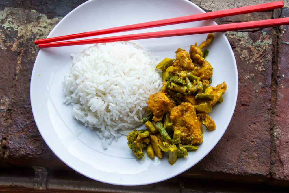 Stir fry meals are not only easy to put together, they offer opportunities to change things up based on whatever is on hand. For example, the protein in this stir fry – although delicious with chicken thighs – could just as easily be tofu; the asparagus could also be substituted.