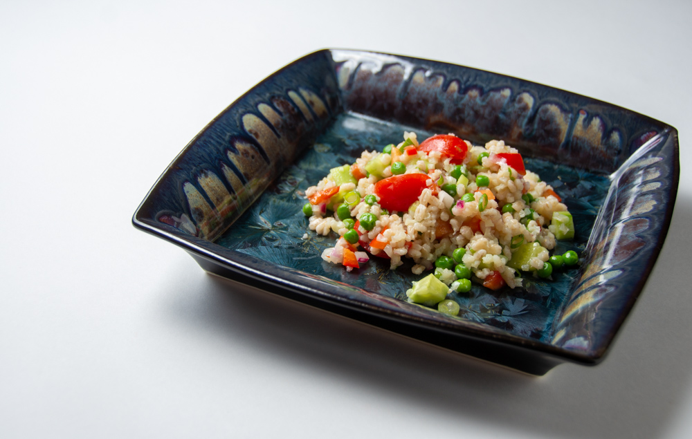 The recipe calls for pearl barley, red onion, scallions, cucumber, cherry tomatoes, a sweet red (or orange pepper) and corn. My substitution for the corn? A half-and-half mix of thawed frozen peas and thawed riced cauliflower (a leftover ingredient from another recipe).