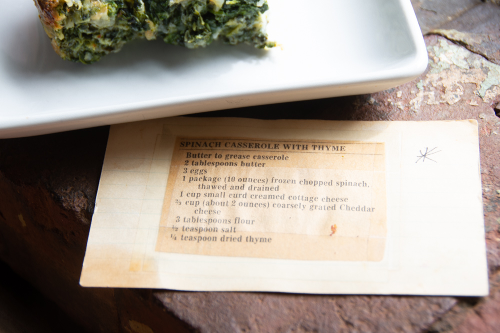 - Add spinach, cottage cheese, cheddar cheese, flour, salt, thyme and melted butter. Stir until ingredients are well combined. Pour mixture into casserole.