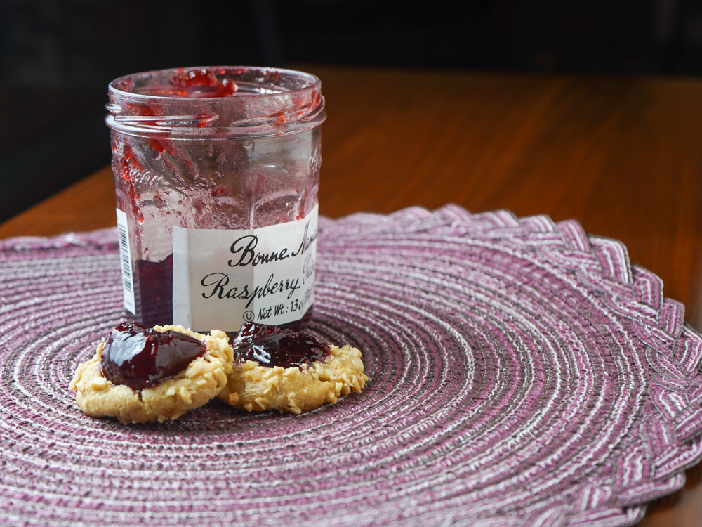 I recently excavated a jar of raspberry preserves from the back of the fridge, so, of course I needed to search for a way to use it up. Out came my dog-earred copy of the Wellesley Cookie Exchange cookbook where, I discovered a classic Thumbprint cookie recipe. The recipe made a batch of crisp short cookies which I covered in almonds and, after baking, filled with preserves. This recipe also withstood our usual substitution to accommodate our granddaughter’s egg allergy.
