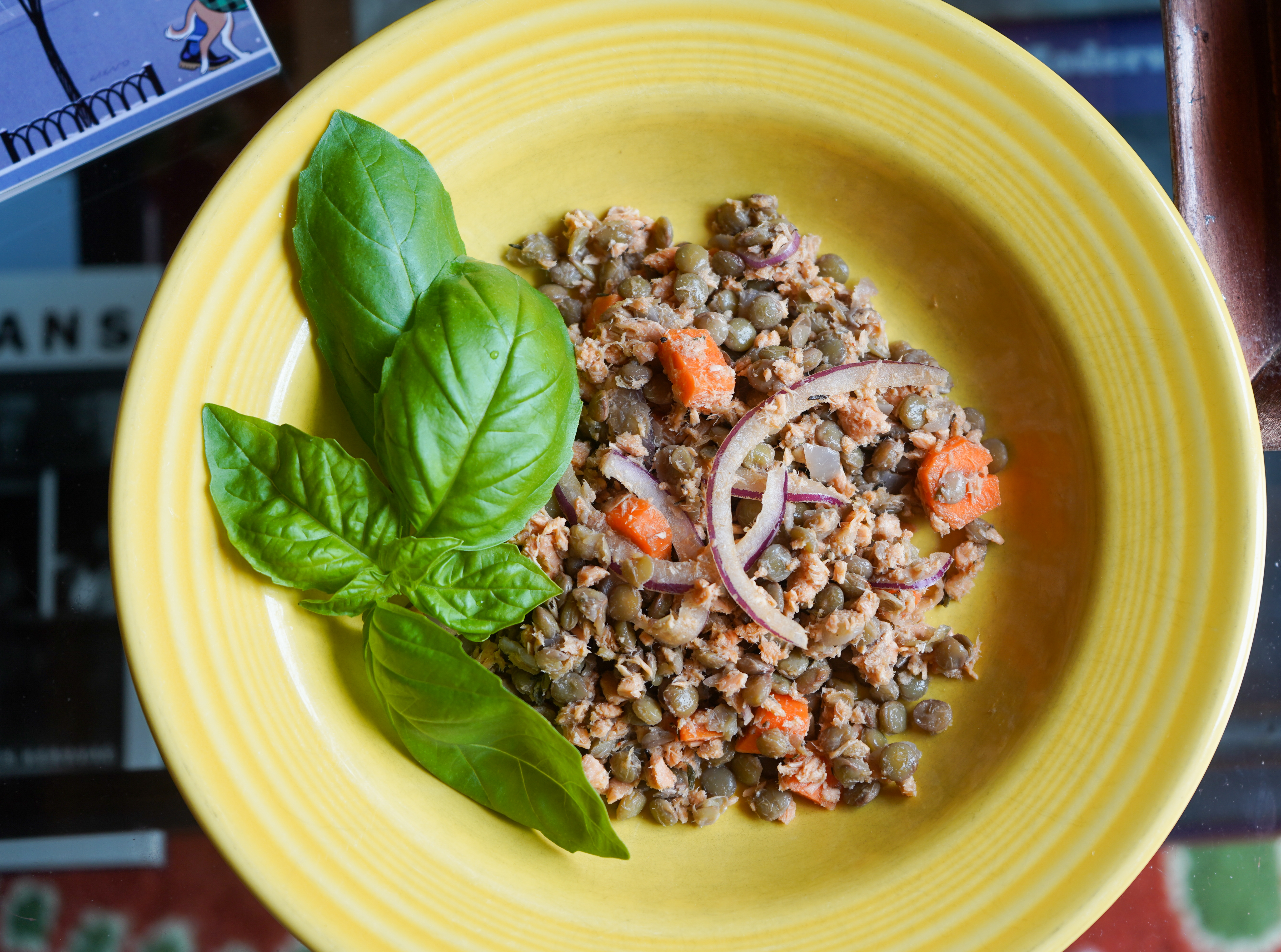 - Divide the lentils among 4 bowls and top with the salmon salad. Serve chilled or at room temperature, with lemon wedges.