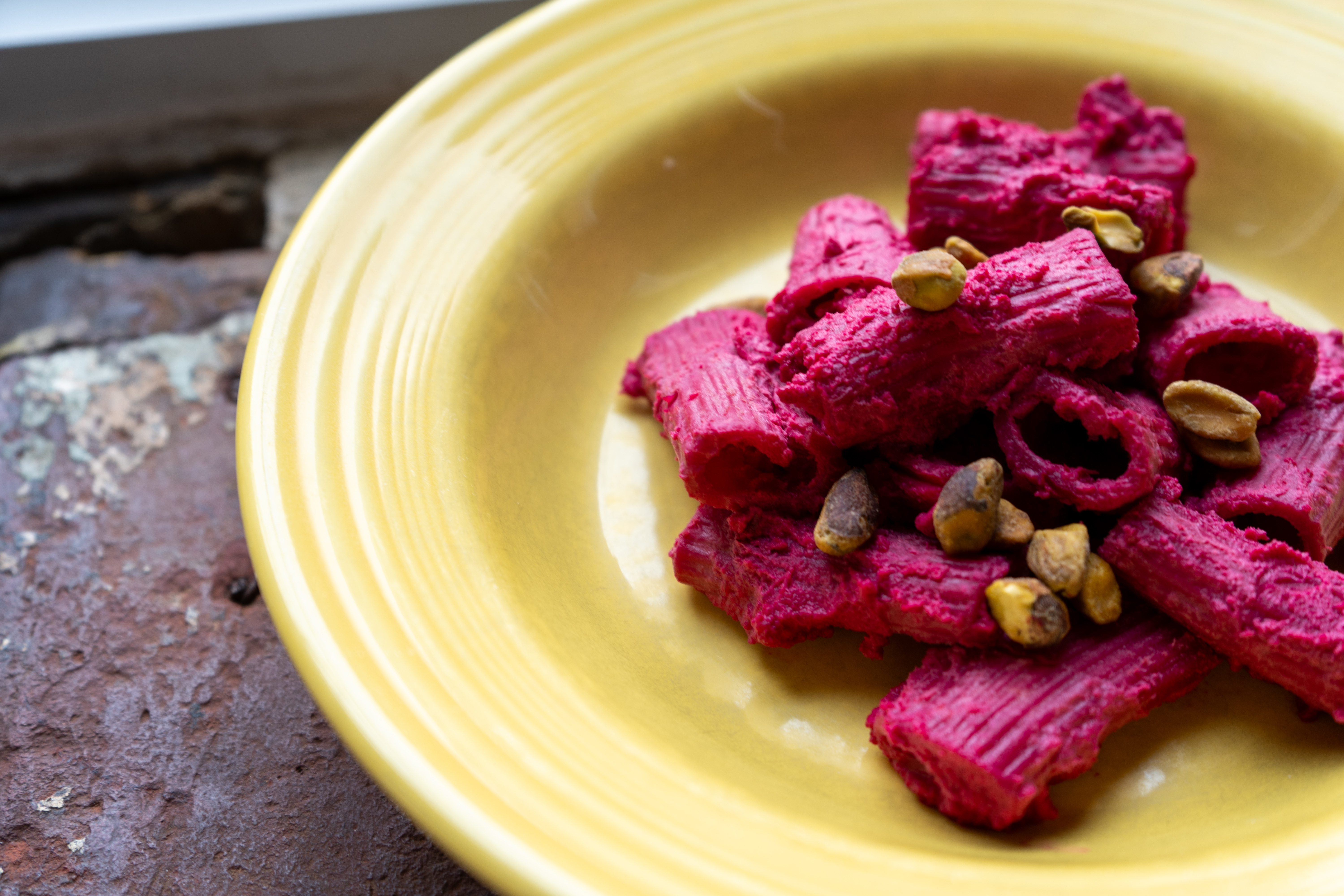 I absolutely love beets in nearly any form, and this spectacular pasta dish, with a sauce made with beets and pasta is one of the tastiest mains I’ve eaten in a long time. Also true: the beautiful red along with pistachios makes for a very festive dish.
