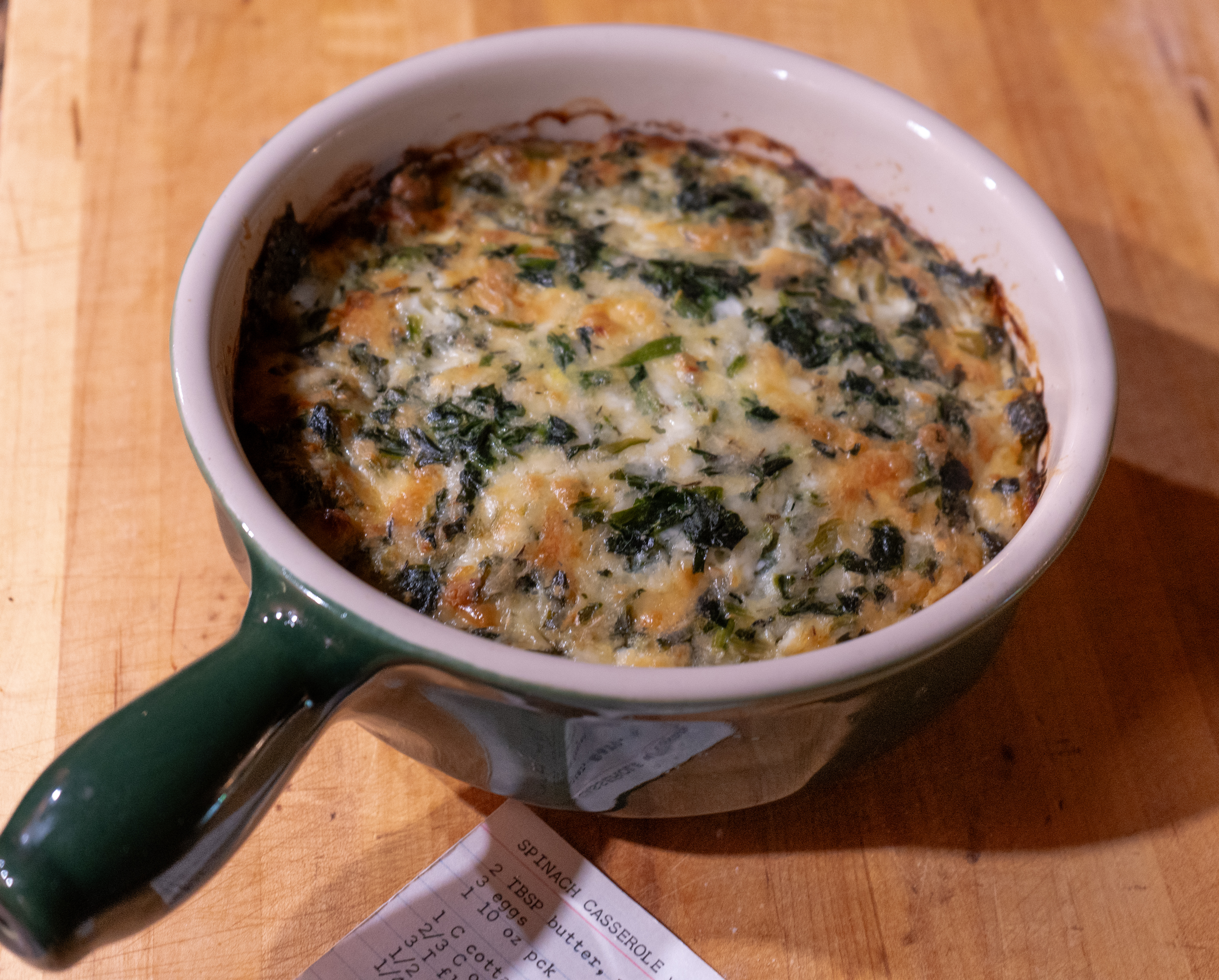 - 1 10-oz package for frozen, chopped spinach (thawed and then drained by squeezing out all of the liquids)