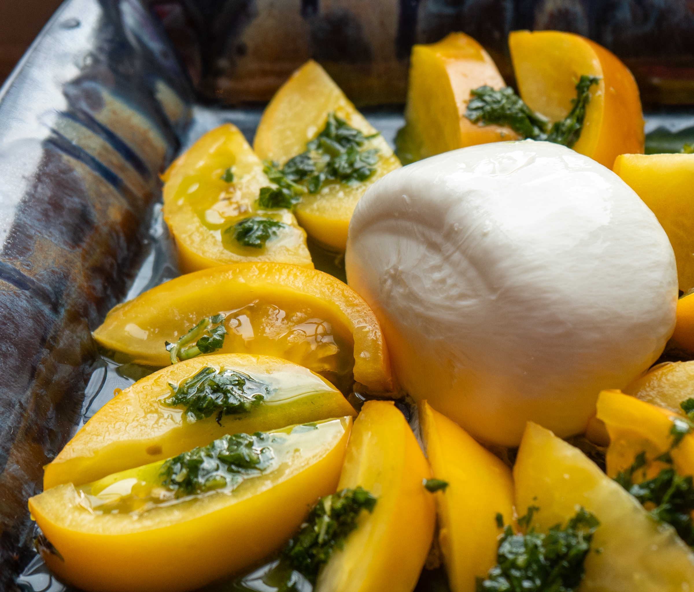Tonight, I used basil leaves two ways. One was to muddle with lemon to make a refreshing aperitivo mocktail. The second basil-based concoction was a basil viniagrette which followed a recipe from The Kitchn. Paired with some leftover burrata and the beautiful slicing tomatoes we also took home from Clark Farm this week, we had a lovely Mediterranean-based salad to go with our meal tonight.