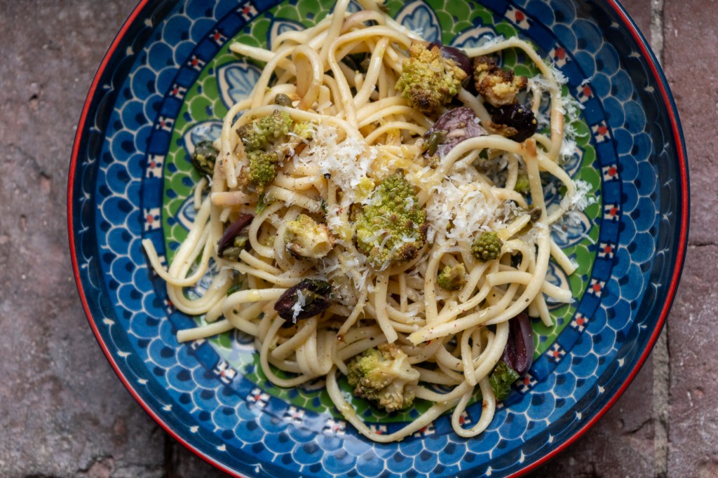 Romasesco is tasty no matter how it is prepared, but adding it to a pasta dish with the saltiness of capers and Kalamata olives is sheer heaven. As we generally do, adding a healthy dose of red pepper flakes made for just the right level of heat.